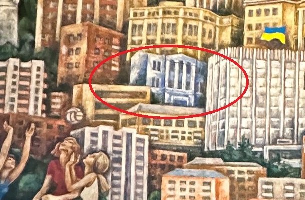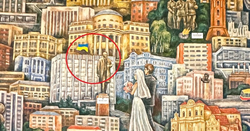 Перше, що кидається в очі, то це сучасний прапор України за пам’ятником Леніну. Вінниця – одне з перших міст, де після оголошення незалежності позбулися символу тоталітаризму. Картина датується 1985 роком, тож прапор домалювали пізніше.