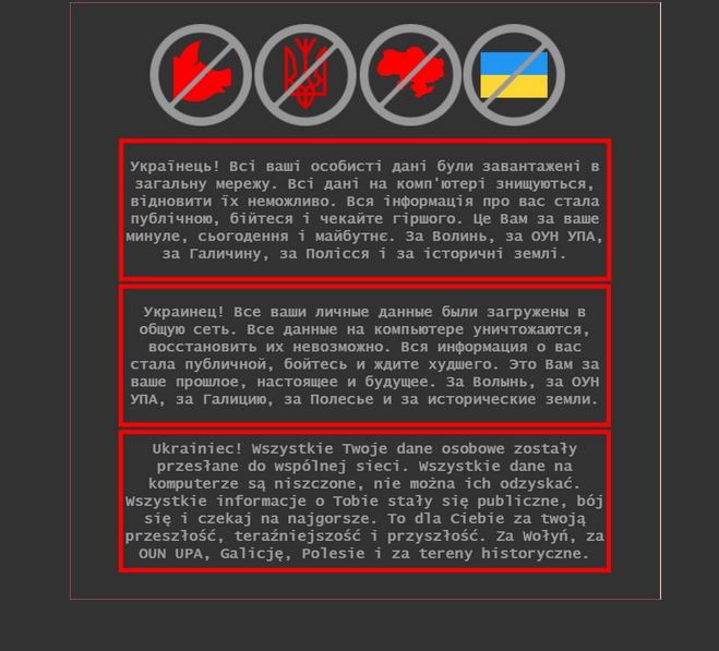 Спершу кібератаки зазнав портал Міністерства освіти й науки, де користувачів «зустрічали» погрозливі повідомлення на українській, російській та польській мовах.