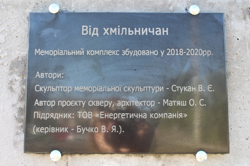Також, на території скверу встановлено бетонні стели з іменами хмільничан – жертв голодомору 1932-33 років і жертв політичних репресій, патріотів-хмільничан, учасників повстанських і військових формувань УНР в 1919-20 рр., що діяли у Вінницькому окрузі і зі статистикою загиблих по Хмільницькому та Уланівському районах.