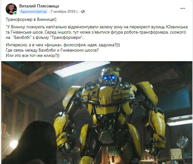 Для довідки: Бамблбі — трансформер, що належить до фракції Автоботів. Забарвлення корпусу — жовте з чорними смугами (звідси і прізвисько, позаяк схоже на забарвлення джмеля); оптичні датчики — блакитні», - написав про нову малу архітектурну інноваційну споруду у перехрестя Гніванського шосе та вулиці Юзвінської депутат міськради Віктор Перлов.