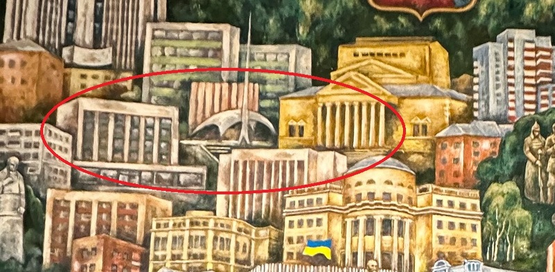 Перше, що кидається в очі, то це сучасний прапор України за пам’ятником Леніну. Вінниця – одне з перших міст, де після оголошення незалежності позбулися символу тоталітаризму. Картина датується 1985 роком, тож прапор домалювали пізніше.