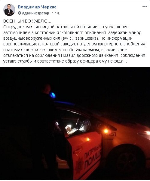 Як вказав у Facebook голова ГО «Комітет безпеки руху» Володимир Черкас, патрульна поліція ввечері 23 серпня запинила кількох водіїв «у погонах» на підпитку.