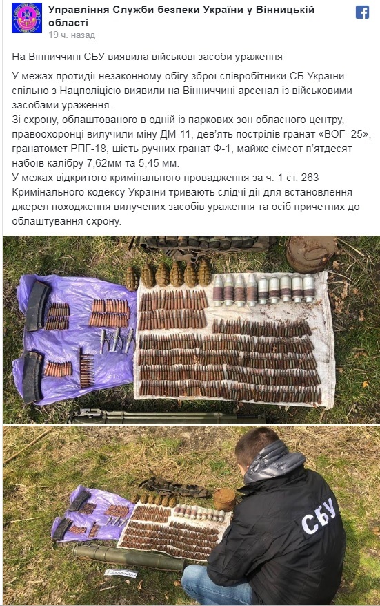 Як повідомляють в прес-центрі УСБУ у Вінницькій області, арсенал був знайдений в рамках операції спільно з Нацполіціей. Зі схованки, обладнаного в парковій зоні, правоохоронці вилучили міну ДМ-11, дев'ять пострілів гранат «ВОГ-25», гранатомет РПГ-18, шість ручних гранат Ф-1, майже сімсот п'ятьдесят патронів калібру 7,62 мм і 5,45 мм .