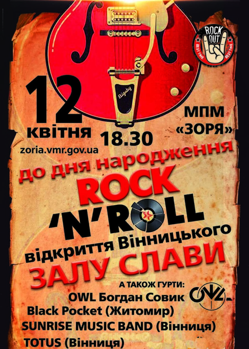 12 квітня у МПМ «Зоря» виступатимуть такі вінницькі гурти, як Sunrise music band, OWL Богдан Сомик та Totus, команда з Житомира Black Pocket. Також мають відкрити Залу слави рок-н-ролу, однак ініціатори її появи не розголошують поки жодних деталей. Напевно, там будуть представлені експонати, які стосуються історії рок-н-ролу – у світі та зокрема нашому місті.