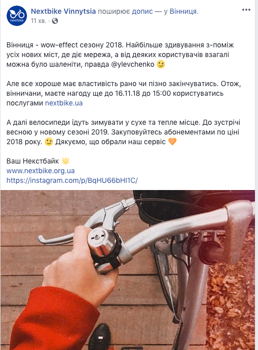 Як повідомляється на офіційній сторінці компанії nextbike.ua у мережі Фейсбук, 16 листопада прокат велосипедів працюватиме до 15:00. Після даної години двоколісні перемістяться на зимівлю «у сухе та тепле місце».