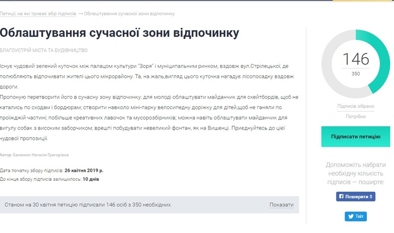 На сайті місцевих петицій було зареєстровано петицію Наталії Баланюк, яка пропонує облаштувати зону відпочинку поблизу міського палацу мистецтв «Зоря».