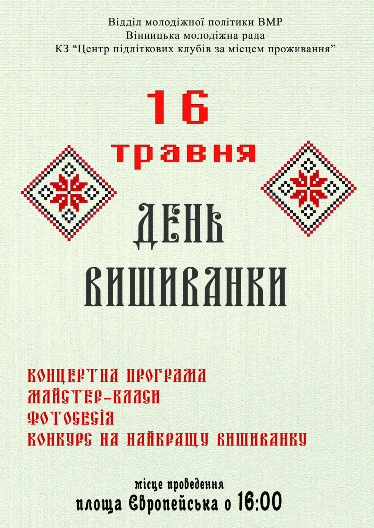 Як повідомили у прес-службі Вінницької міської ради, до міжнародного Дня вишиванки 16 травня об 16:00 у Вінниці на площі Європейській відбудеться святування.